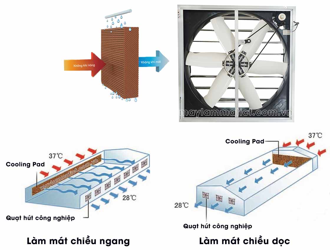 Khi hệ thống làm mát nhà xưởng hoạt động, một phần nước bay hơi vào trong không khí để giảm nhiệt, phần còn lại được quay trở lại để tiếp tục một vòng tuần hoàn mới, đồng thời luôn có một lượng nước được cung cấp bổ sung để bù lại phần nước đã mất do bay hơi. Ống dẫn gió có nhiệm vụ mang luồng không khí mát đến trực tiếp những vị trí cần thiết vì thế làm mát cục bộ hơn.