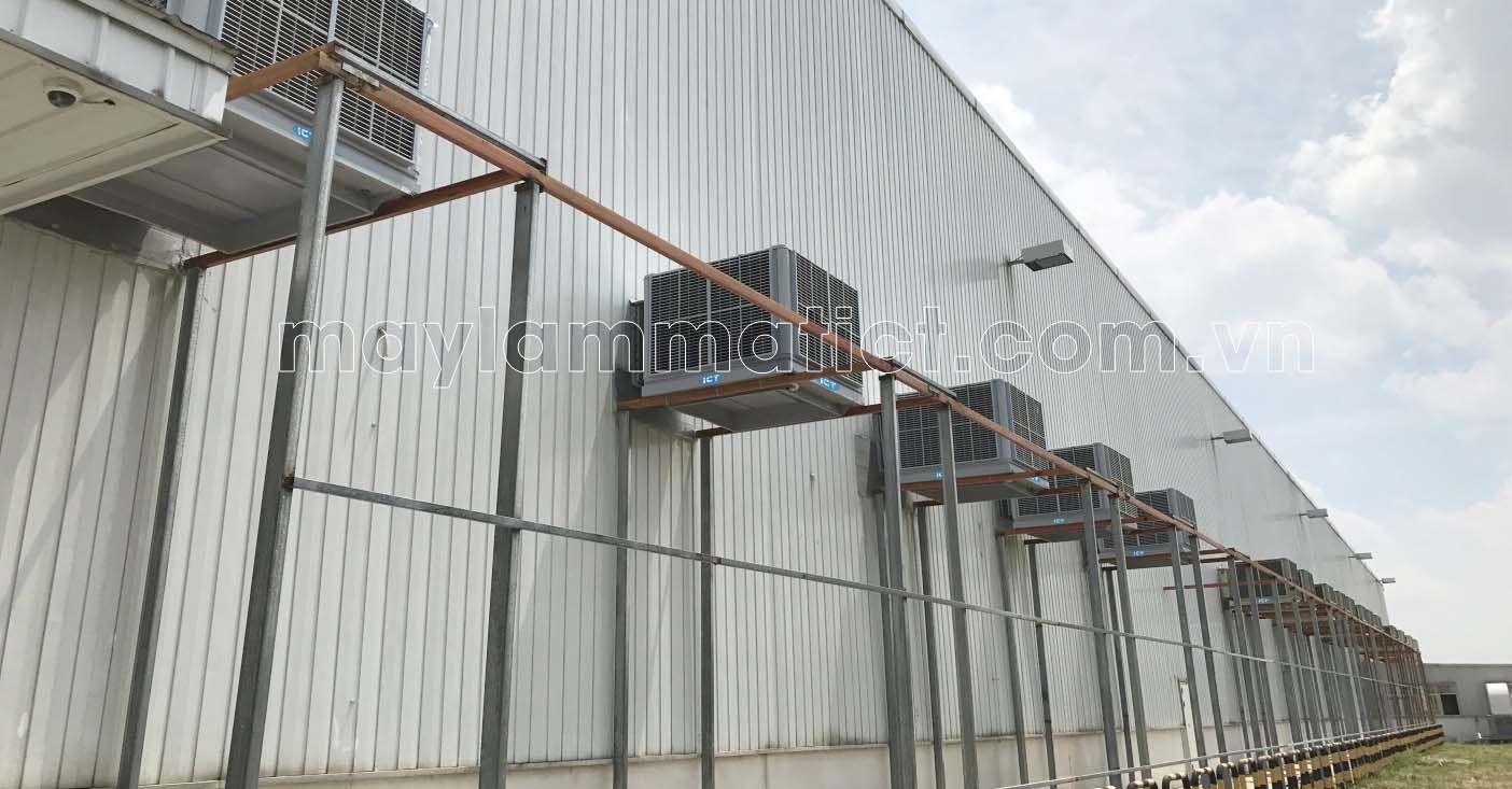 Một đầu hồi nhà xưởng lắp đặt hệ quạt làm mát nhà xưởng công nghiệp với lưu lượng gió lớn để hút toàn bộ không khí nóng, ô nhiễm và bụi công nghiệp trong xưởng thải ra ngoài. Tại đầu hồi nhà xưởng phía đối diện lắp đặt hệ khung trao đổi nhiệt cấu thành từ dàn làm mát công nghiệp được cấp nước đều đặn và mang luồng không khí sạch, mát, độ ẩm thích hợp giúp nhiệt độ không khí trong nhà xưởng được giảm đáng kể.