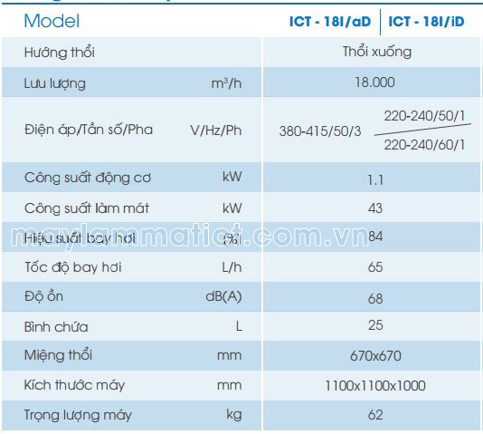 Thông số kỹ thuật Máy làm mát ICT-18I/D
