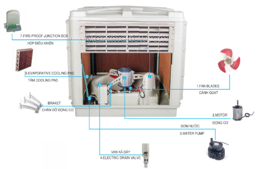 Tấm làm mát kèm các lưới lọc bụi: Bốn mặt của máy làm mát công nghiệp có gắn cố định các tấm làm mát kèm các lưới lọc bụi. Tấm làm mát được thiết kế dạng lỗ tổ ong, có kết nối với hệ thống chia nước, giúp nước được chia đều trên mọi điện tích của tấm làm mát, chống hắt nước ra ngoài.