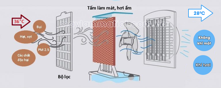 Máy làm mát công nghiệp sẽ hút không khí nóng từ ngoài vào trong qua tấm làm mát đã bị ướt, tại đây xảy ra quá trình trao đổi nhiệt độ giữa hơi nước và không khí, làm giảm nhiệt độ của không khí.